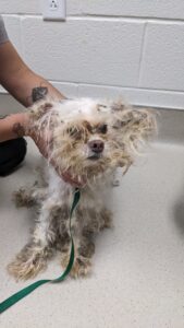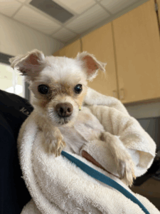 Edison, an 11-year-old Poodle mix, came to the APL in urgent need of medical attention. During his exam, our veterinary team discovered a rubber band tightly wrapped around his ear, leaving it infected and beyond repair. Edison underwent surgery to remove his damaged ear, along with neuter and dental procedures. Thanks to compassionate support from donors like you, Edison received the expert care he needed to heal. After recovering in a loving foster home, Edison was adopted into a loving family where he’s thriving!
